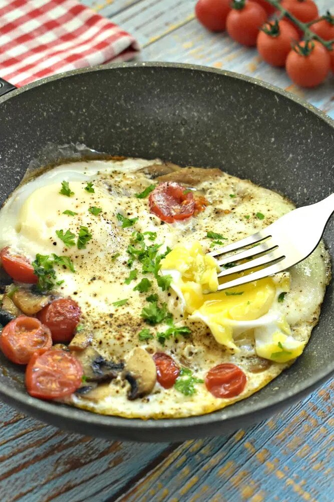 Приготовление яичницы может быть настоящим искусством, особенно когда к ней добавлены свежие шампиньоны и яркие помидоры черри. Этот простой, но сытный рецепт станет отличным выбором как для завтрака, так и для легкого перекуса в течение дня.