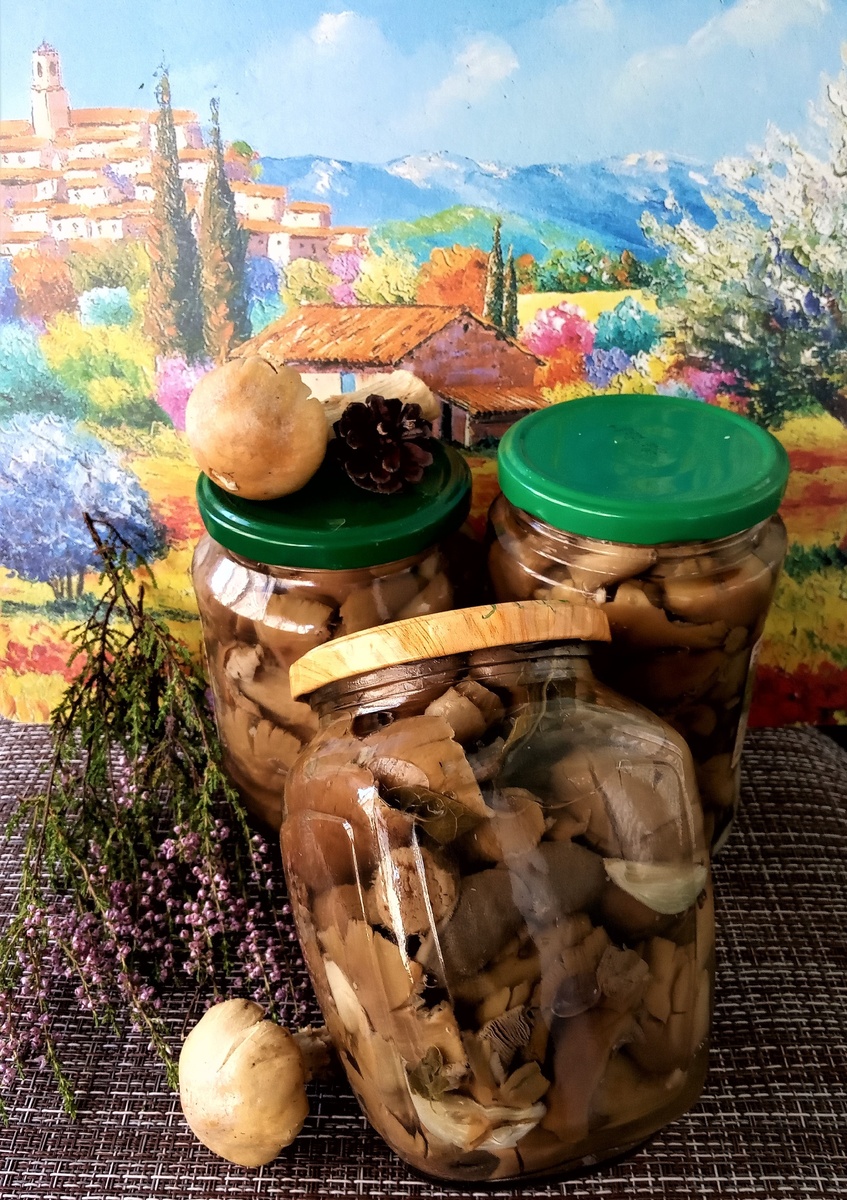 Готовые грибы раскладываются по чистым стерилизованным банкам и заливаются горячим маринадом. Затем банки укутываются теплым одеялом до полного остывания. Эти маринованные колпаки могут храниться без холодильника, что делает их идеальным вариантом для зимнего хранения.