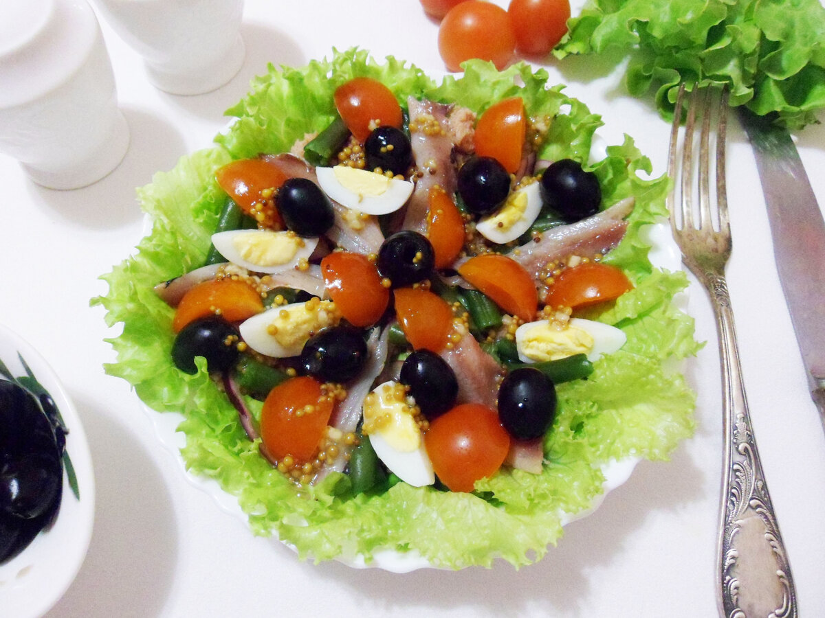 Для начала стоит отварить стручковую фасоль в кипящей, подсоленной воде, чтобы она сохранила яркий зеленый цвет. Яйца также нужно отварить до состояния «вкрутую» и нарезать. Овощи - помидоры черри и соленую рыбу - следует нарезать на части, а консервированный тунец лучше размять вилкой. Собирать салат можно по принципу слоев: сначала листья салата, затем фасоль, тунец, яйца, овощи и маслины, и в финале – щедро полить заправкой.
