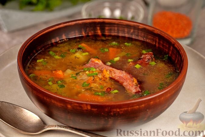 - Ингредиенты: тыква, красная чечевица, картофель, лук, копченые ребрышки и специи.