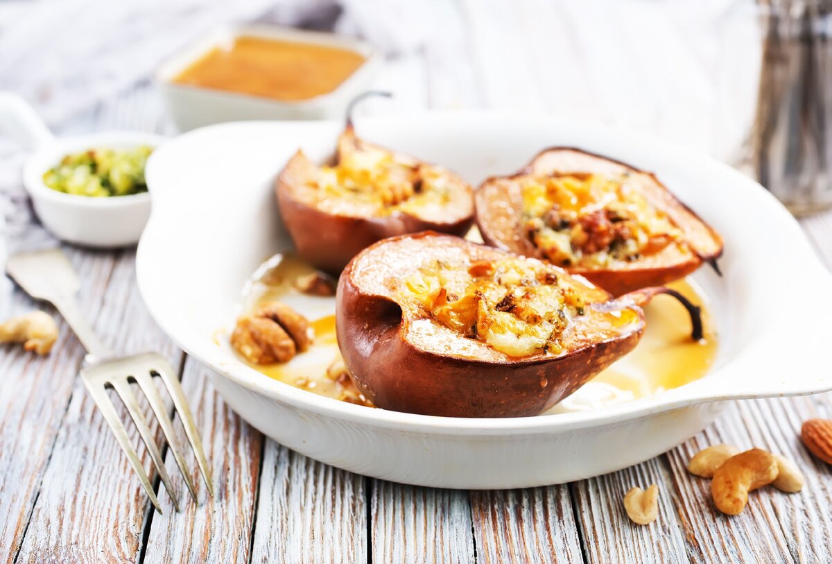 Для достижения наилучшего результата, стоит использовать несколько видов сыра, в том числе сыр с плесенью. Груши для запекания должны быть крепкими и зрелыми — слишком мягкие экземпляры могут распасться в процессе готовки.