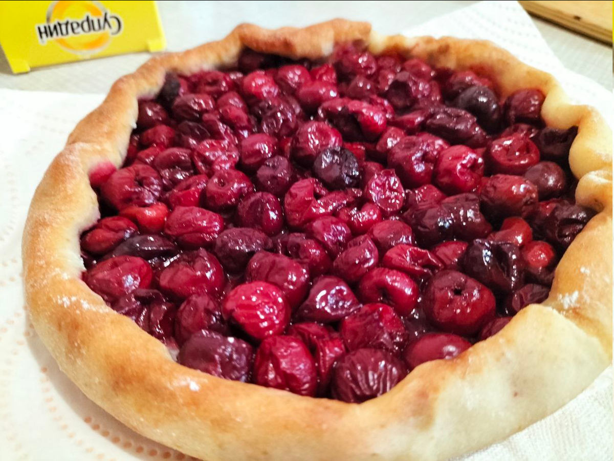 Когда тесто остынет, его раскатывают в круг толщиной около полсантиметра, размещают вишню по центру и присыпают сахаром. Края теста поднимают и защипывают, создавая «бортики» для пирога.