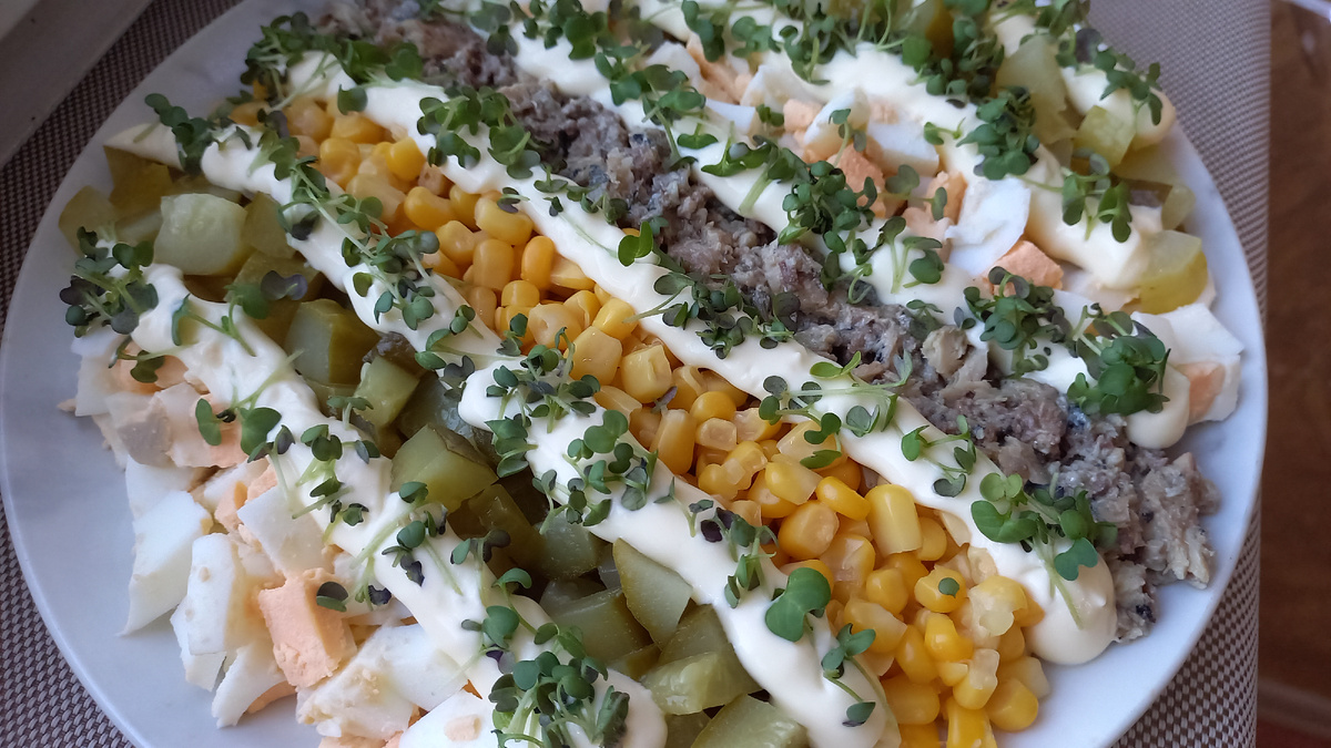 Не забудьте использовать майонез — им можно аккуратно «обвести» слои, добавляя эстетики вашему творению. Для заключительного штриха посыпьте блюдо нарезанной свежей зеленью.