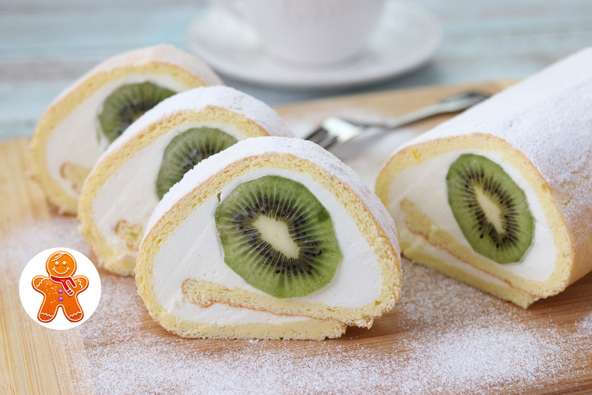 На остывший бисквит нанести крем, выложить нарезанные киви и аккуратно свернуть в рулет. Убрать на несколько часов в холодильник, а перед подачей можно присыпать сахарной пудрой. Этот рулет станет не только изюминкой праздника, но и великолепным домашним десертом!