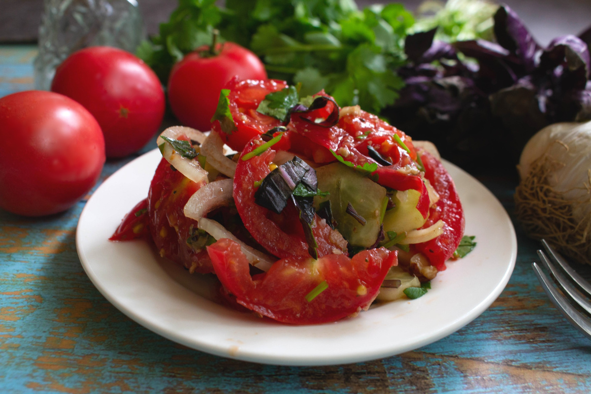 Для начала, нарезаем помидоры полукружочками, а огурцы очищаем и режем кружками. Репчатый лук нарезаем тонко и обдаем кипятком для уменьшения горечи. Измельчаем зелень по желанию – чем больше, тем лучше!