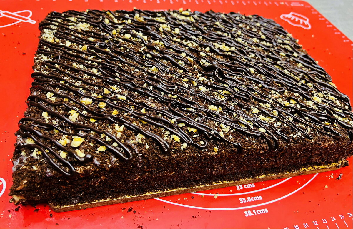 После остывания коржей, их края обрезаются и пропитываются. Затем следует щедро смазать их кремом, украсить бисквитной крошкой, орехами и шоколадом. Оставьте торт пропитаться, и он готов к подаче!