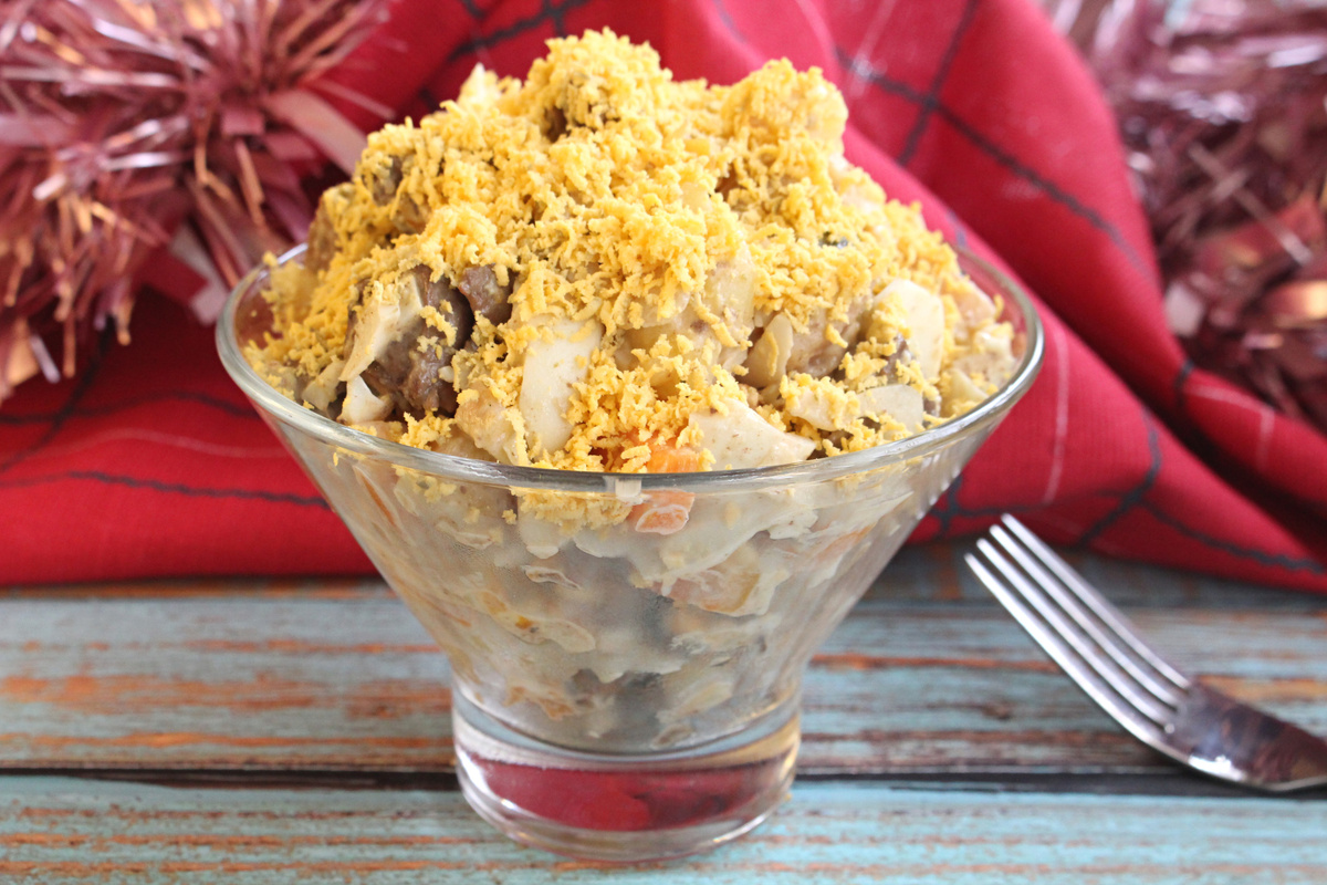 Подавайте салат в общем блюде или разложите по порциям, украсив желтком для дополнительного эстетического эффекта. Приятного аппетита!