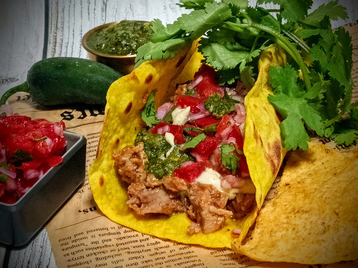 Погрузитесь в мир ярких вкусов с этим уникальным рецептом тако! Запеченная свинина, маринованная в соусе шрирача с пряными нотами ямайской кухни, объединяется с необычной сальсой верде на основе киви. Охлаждающий соус на основе авокадо со сметаной придаёт блюду свежесть, а добавление томатов, лука шалот и кинзы создает яркий, насыщенный вкус.