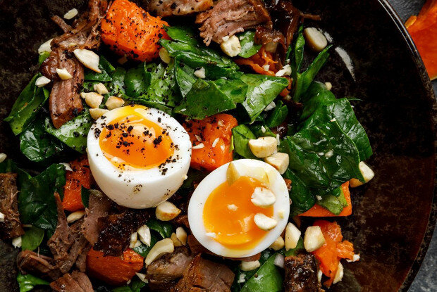 Шпинат моют, избавляются от крупных стеблей и нарезают. Затем его смешивают с тыквой и заправляют соусом унаги, оливковым маслом и лимонным соком. На финальном этапе к салату добавляют горячий брискет, рубленый миндаль, половинку яйца и мелко нарезанные маслины для яркого акцента!