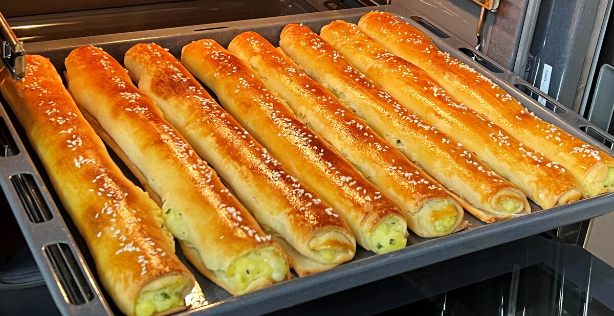 Смажьте рулеты яйцом и присыпьте кунжутом. Установите в разогретую до 180 градусов духовку на 25 минут. После выпечки пироги можно подавать к столу с легким соусом или просто в чистом виде. Приятного аппетита!