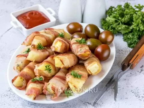 - Картошка в беконе: Потрясающее сочетание картофеля и бекона готовится за 35 минут. Просто заверните кусочки картофеля в ломтики бекона, посыпьте специями и отправьте в духовку.