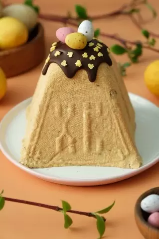 6. Готовую пасху освободить от формы и марли. Украсить по желанию: для этого растопить шоколад и полить им десерт, а также добавить цветные посыпки и шоколадные яйца.
