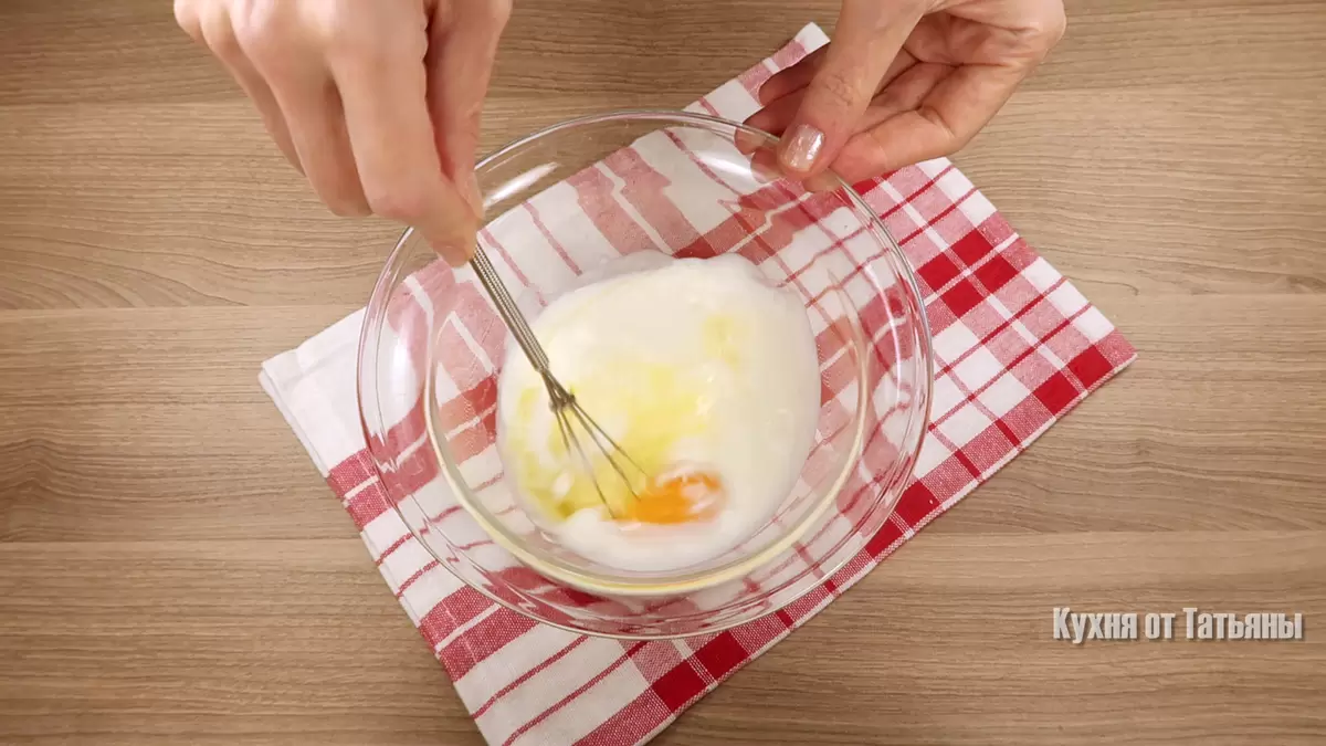 Начинается процесс с соединения кефира, сметаны, яйца, щепотки соли, ванильного сахара и столовой ложки обычного сахара в глубокой тарелке. Все ингредиенты тщательно перемешиваются, а затем ставятся в сторону.