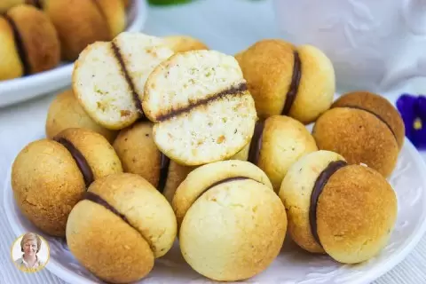 Тем временем можно растопить шоколад. Простой способ: наломать его на небольшие кусочки, поместить в кондитерский мешок и опустить в горячую воду на 5-10 минут. После этого соедините половинки печенья, добавив немного растопленного шоколада между ними. Уберите печенье в холодильник на 30 минут, чтобы шоколад застыл.