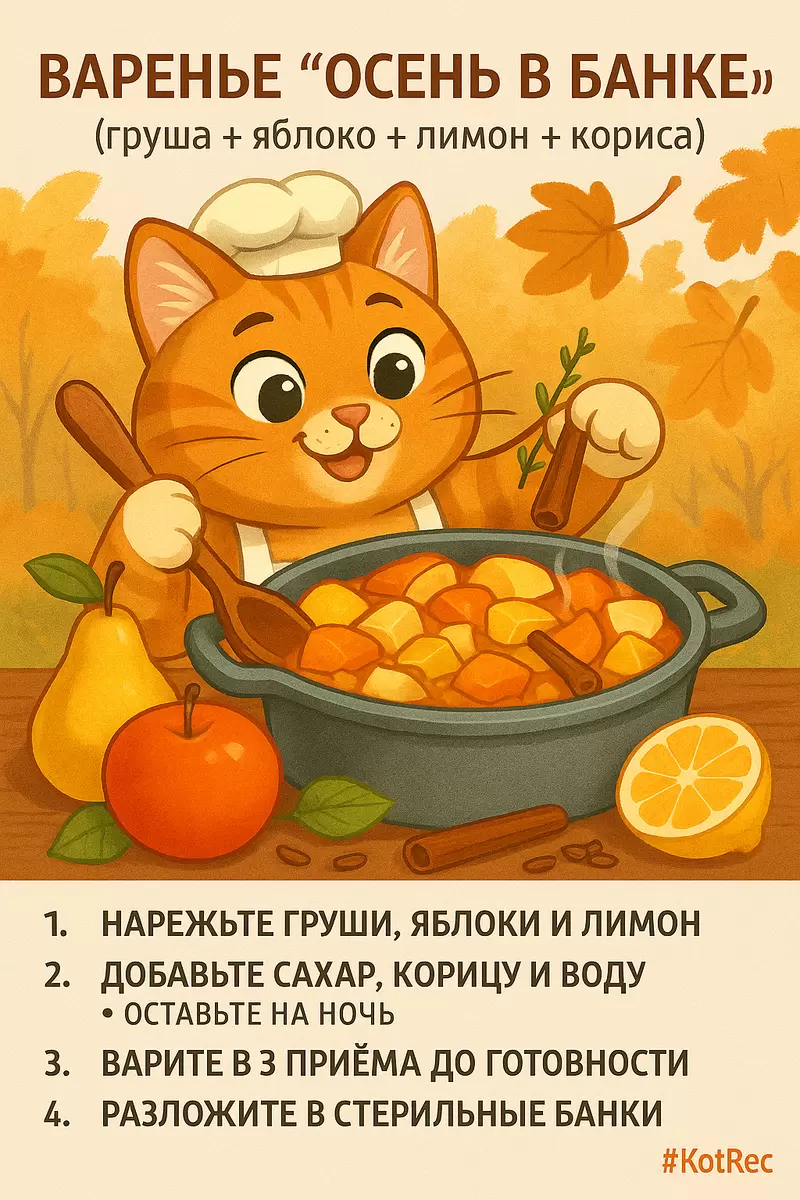 Подготовка фруктов: Тщательно вымытые яблоки и груши следует освободить от сердцевины и нарезать дольками толщиной 5-7 мм. Лимон нарезается кружками, предварительно удалив косточки.Приготовление сиропа: В кастрюлю налить воду, добавить сахар и корицу. Довести до кипения и варить 3-5 минут, пока не образуется ароматный сироп.Добавление фруктов: Влить фрукты в сироп и оставить на 6-8 часов или на ночь для насыщения.Варка: Процесс варки проходит в три этапа: первый — кипятить 10 минут, затем охладить; второй — опять кипятить 10 минут и снова охладить; третий — варить 15 минут до получения карамельной густоты. Это сохранит фрукты целыми и прозрачными, а сироп подарит удивительный янтарный цвет.Консервация: Разлить горячее варенье по стерилизованным банкам и закрутить крышками. Перевернуть и укутать, дав полностью остыть.Для улучшения вкуса можно добавить щепотку ванили или орехи на финальном этапе. Сорт яблок с высоким содержанием пектина гарантирую получение более густого варенья. Каждая ложка этого лакомства станет настоящим глотком сладости и тепла, наполняя осень удивительными ароматами и вкусами.