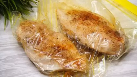 Можно использовать как обычный пакет, так и рукав для запекания. В чашу мультиварки заливают около 1,5 литров воды и помещают пакет с курицей. Благодаря отсутствию воздуха, грудка опустится на дно. Затем требуется установить режим "мультиповар", выбрав температуру 70 градусов, и задать время 1 час.