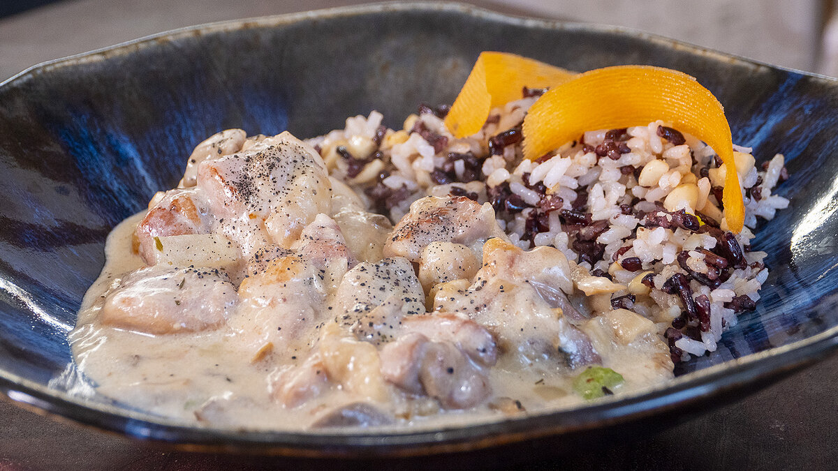 Затем в сковороду добавляют молоко и сметану, всё аккуратно перемешивают и готовят еще пару минут. Рис, который идеально сочетается с фрикассе, жарится отдельно с чесноком, арахисом, и добавлением горчицы и лимонного сока для пикантности.
