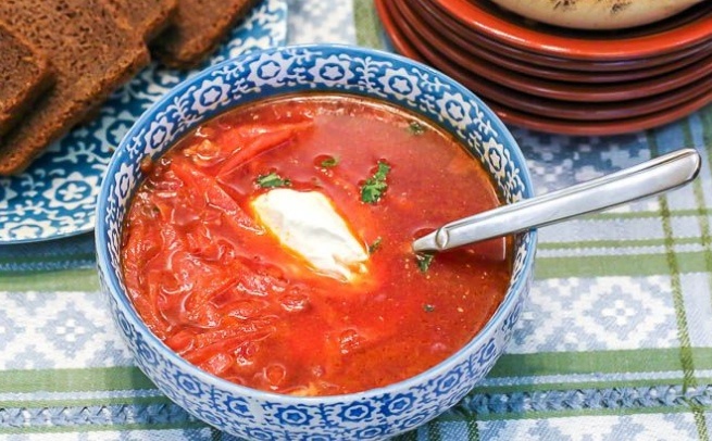 Как только борщ готов, его стоит настоять под крышкой перед подачей. В каждую тарелку добавляется порция вареного мяса, ложка сметаны и свежая зелень — блюдо готово!
