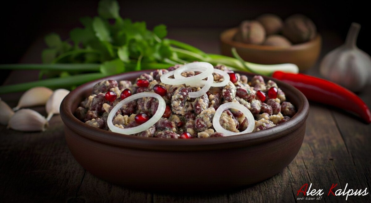 Приготовление: Замочите фасоль на ночь, затем отварите её. Параллельно подготовьте маринованный лук и ореховый соус. Смешайте все ингредиенты и дайте настояться для раскрытия вкусов.