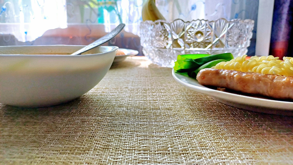 - Жареные колбаски с чесноком, поданные с макаронами и свежим зелёным луком — идеальное сочетание для летнего обеда.