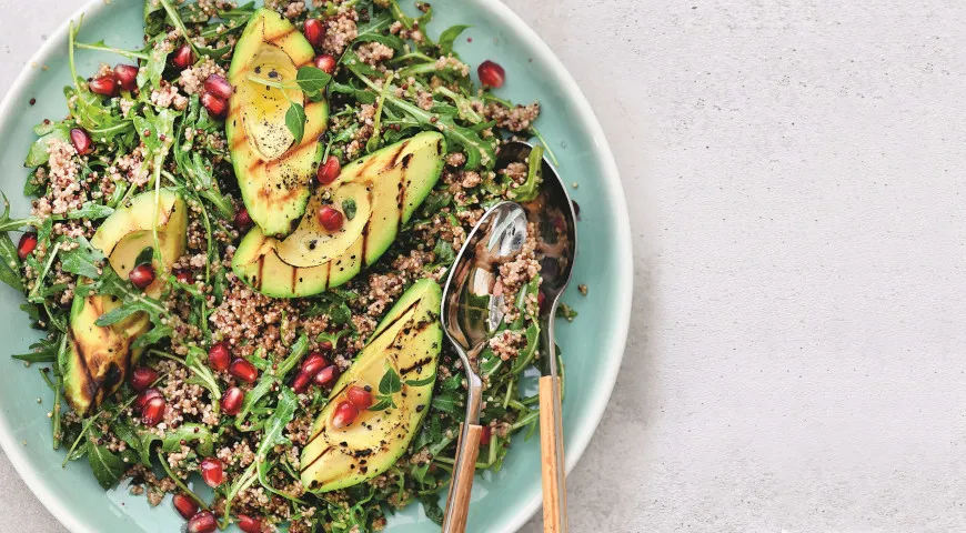 Этот салат — настоящая находка для здоровья, так как он наполнен витаминами и микроэлементами. Киноа является источником белка и аминокислот, не содержит глютен и легко усваивается. Авокадо наполняет организм полезными жирами и витаминами группы B, а свежие овощи обогащают блюдо клетчаткой, витаминами C и K. Лимонная заправка добавляет нотку свежести и способствует пищеварению.