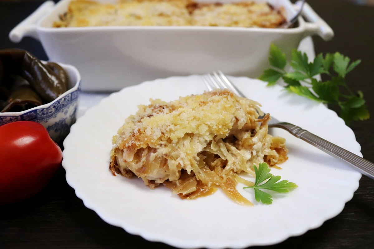 4. Подготовить форму: выложить половину капусты, затем слой жареной рыбы, затем лук и накрыть оставшейся капустой. Залить сметанным соусом и дать настояться в течение 5 минут.