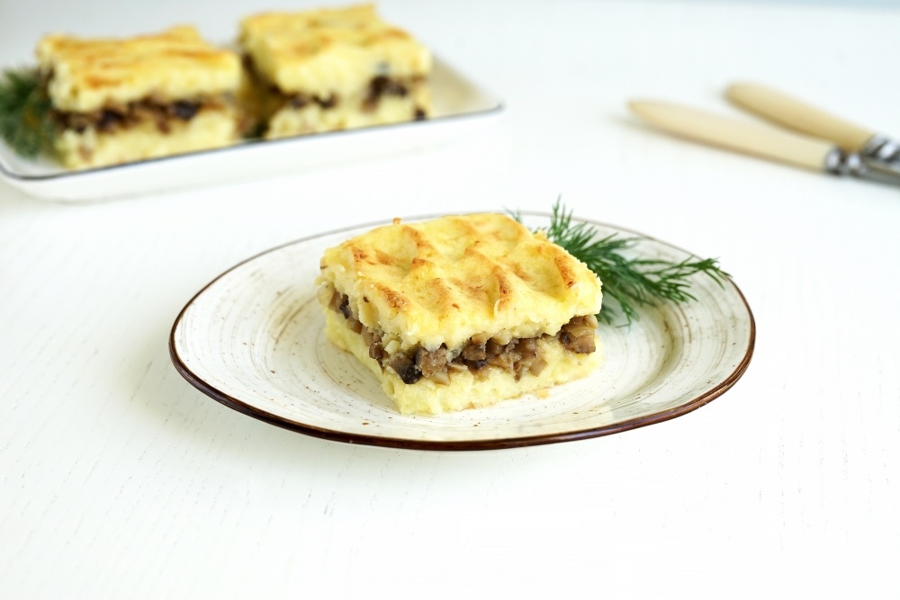 Сначала грибы вместе с луком обжариваются до золотистой корочки. Далее картофель отваривается и превращается в нежное пюре с добавлением молока и сливочного масла. Готовую массу укладывают в форму: сначала слой картофеля, затем грибная начинка и снова картофель.
