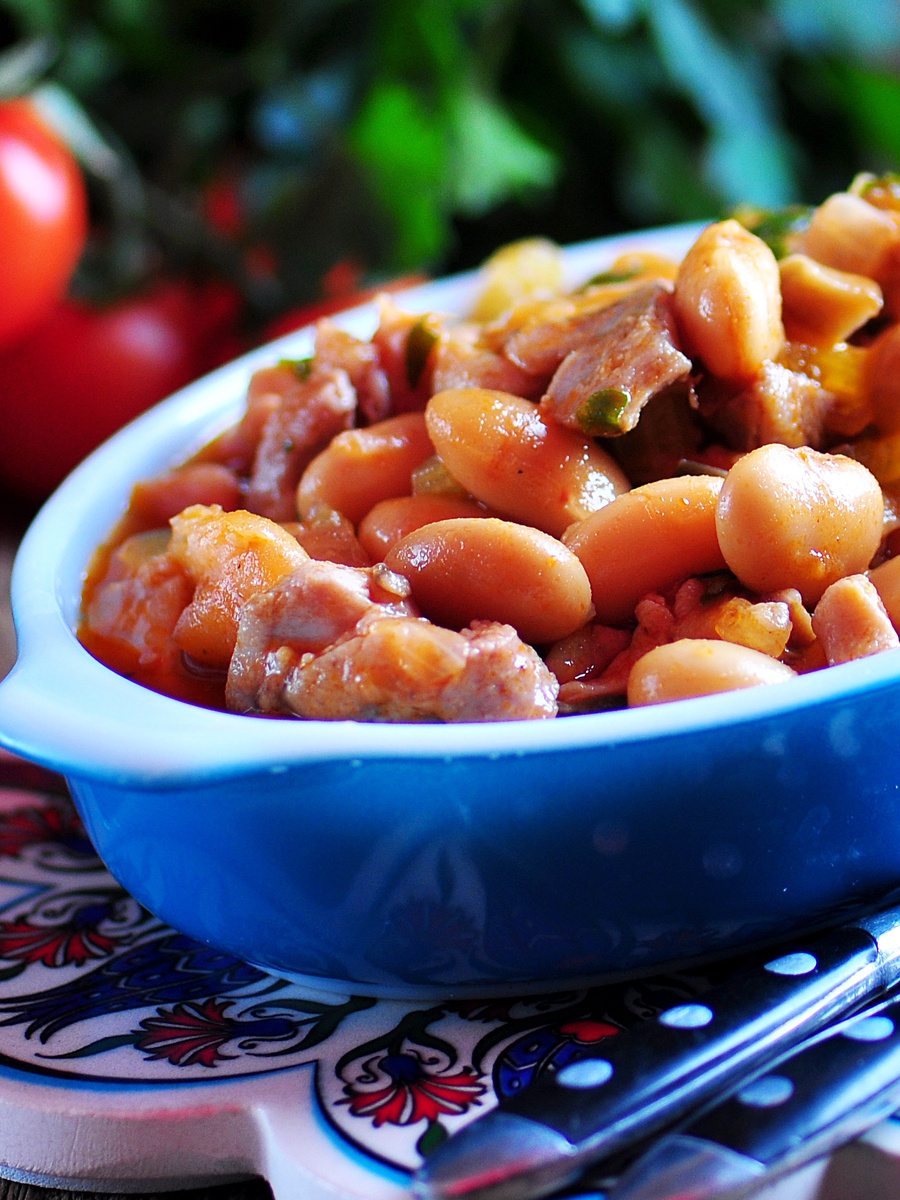 4. Откройте банку фасоли и вылейте содержимое в сковороду. Если хотите больше соуса, добавьте немного воды, но не переборщите. Приправьте солью и перцем, уменьшите огонь и томите под крышкой в течение 15 минут.