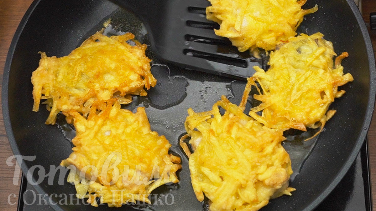 3. Жарка: Картофель натереть на крупной терке, делая это по мере необходимости, чтобы он не потемнел. Каждый кусочек рыбы обмакнуть в кляр, затем обвалять в тертом картофеле. На разогретую сковороду с растительным маслом выложить обжаренную рыбу. Готовить до золотистой корочки с обеих сторон на среднем огне. Выложить готовые кусочки на бумажное полотенце, чтобы удалить излишки масла.