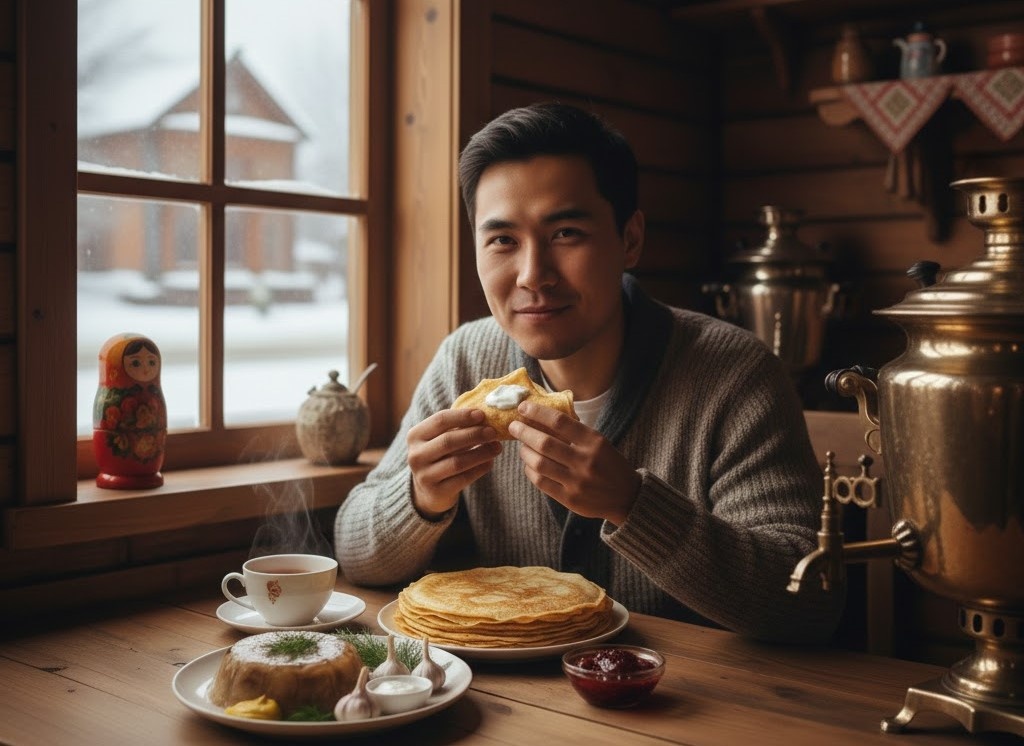 На недавнем празднике Масленицы тайский студент, знакомый с русской культурой, смог своими глазами увидеть этот светлый праздник. Впервые он посетил квартиру русского друга и попытался испечь блины — традиционное русское блюдо, полюбившееся многим. Блины, хотя и простые по виду, оказались настоящим угощением, особенно с медом, сыром и мясом. Холодец, которому он не был знаком, также вызвал его удивление, хотя внешне он выглядит немного непривлекательно.