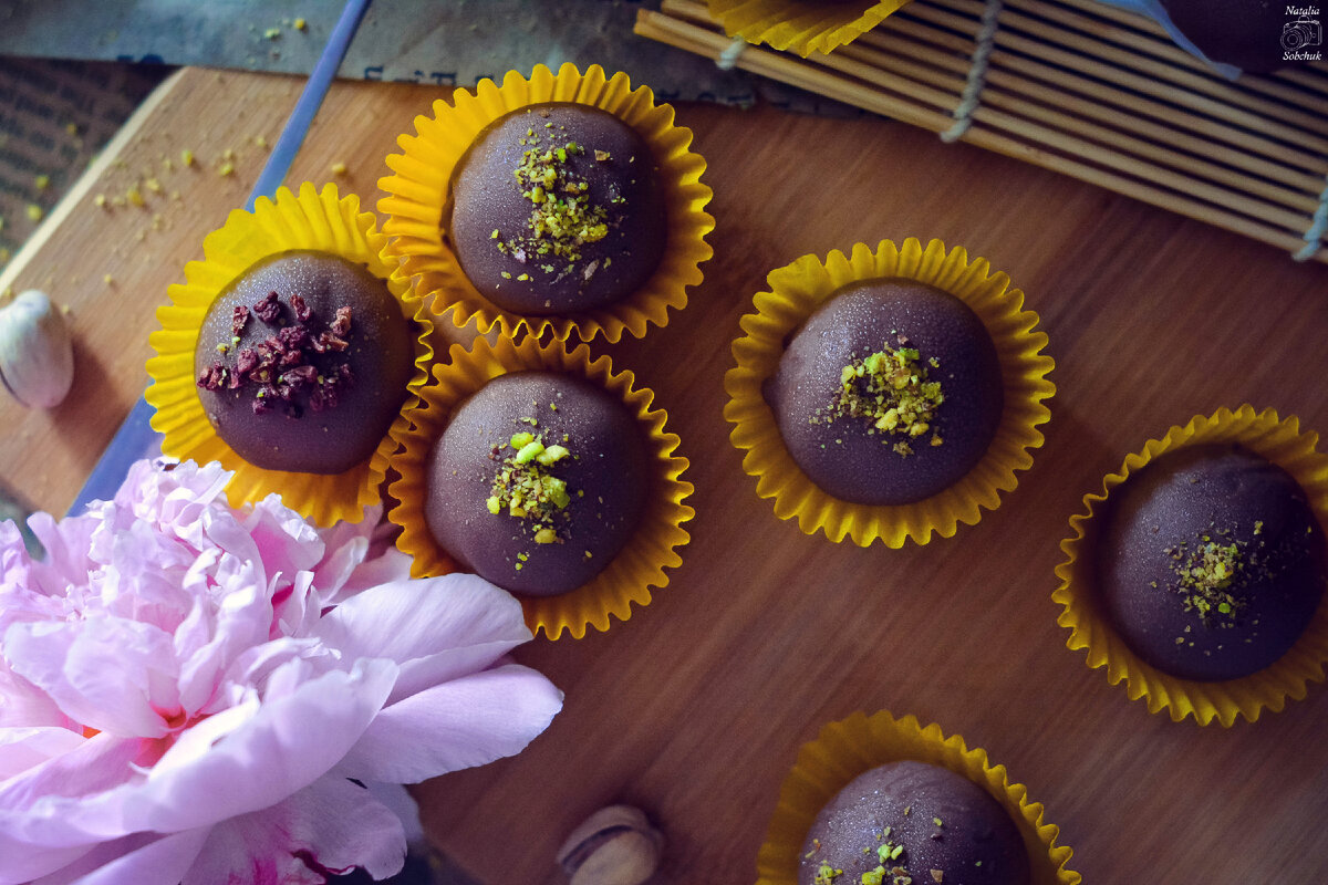 Когда шарики охлаждены, растопите шоколад на водяной бане, добавив к нему три столовые ложки безвкусного растительного масла, чтобы добиться нужной консистенции. Каждый шарик аккуратно обмакнуть в растопленный шоколад, а затем посыпать сверху сублимированной малиной или дробленой фисташкой для дополнительного шарма.