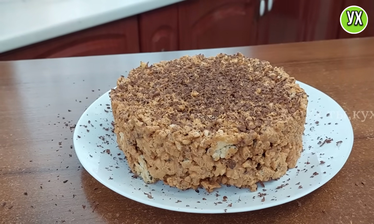 Перед подачей торт можно украсить тертым шоколадом, однако он и в простом виде выглядит замечательно. Этот десерт порадует вас своей сочностью и хрустящей текстурой, и создаст отличное настроение в компании гостей.