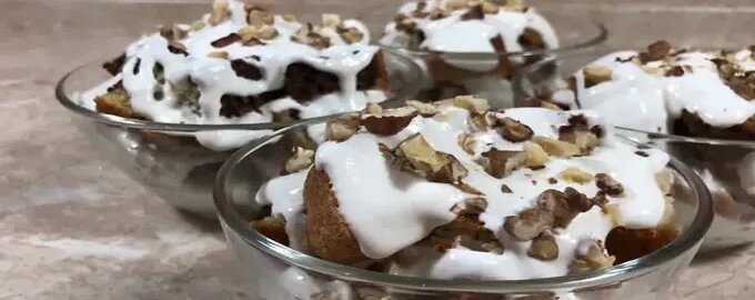 7. В креманки слоями укладываются крем и бисквит, посыпая орехами. Это может показаться трудоемким, но итоговый результат стоит затраченных усилий!