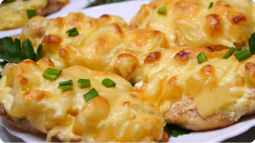 Секрет этого блюда кроется в простоте: быстрое обжаривание сохранит соки внутри мяса, а сметано-майонезная основа сделает соус нежным. Консервированные ананасы добавят сладость и немного кислинки, а сыр, плавясь, образует аппетитную корочку. Результат? Курица, которую легко разрезать даже вилкой!