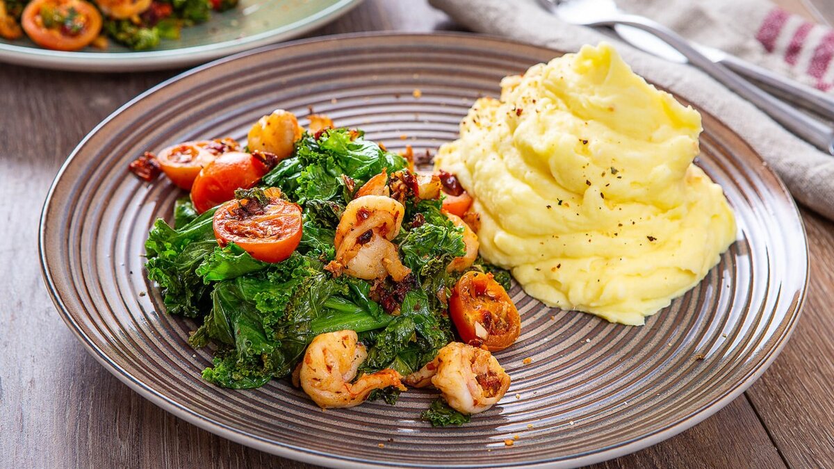 7. Подавайте картофельное пюре на тарелках, рядом разместив креветки с овощами. Приятного аппетита!