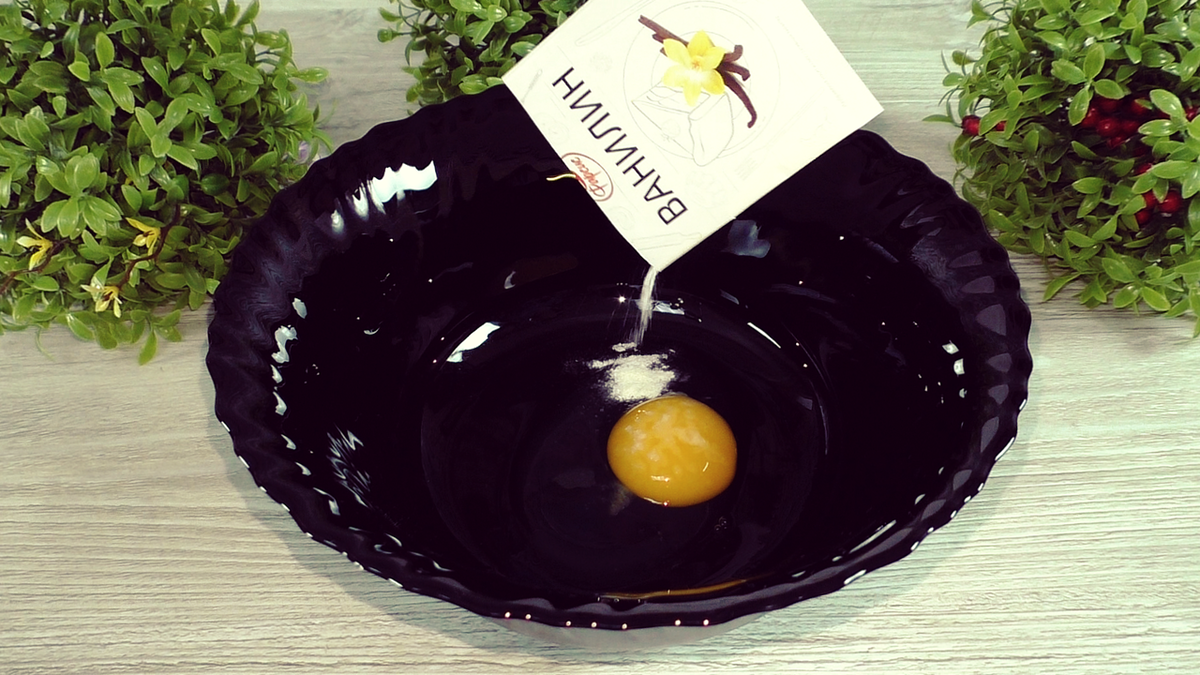 Сначала в глубокой миске смешать яйцо с щепоткой соли, добавить ванилин или ванильный сахар. Затем всыпать сахар и перемешать до однородности. Далее влить растительное масло.