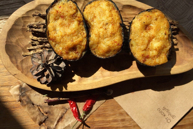 После жарки разрежьте каждый клубень пополам вдоль. Аккуратно выньте мякоть и смешайте ее с аджикой, добавив сливочное масло. Затяните в фольгу и верните в духовку на несколько минут для подогрева.