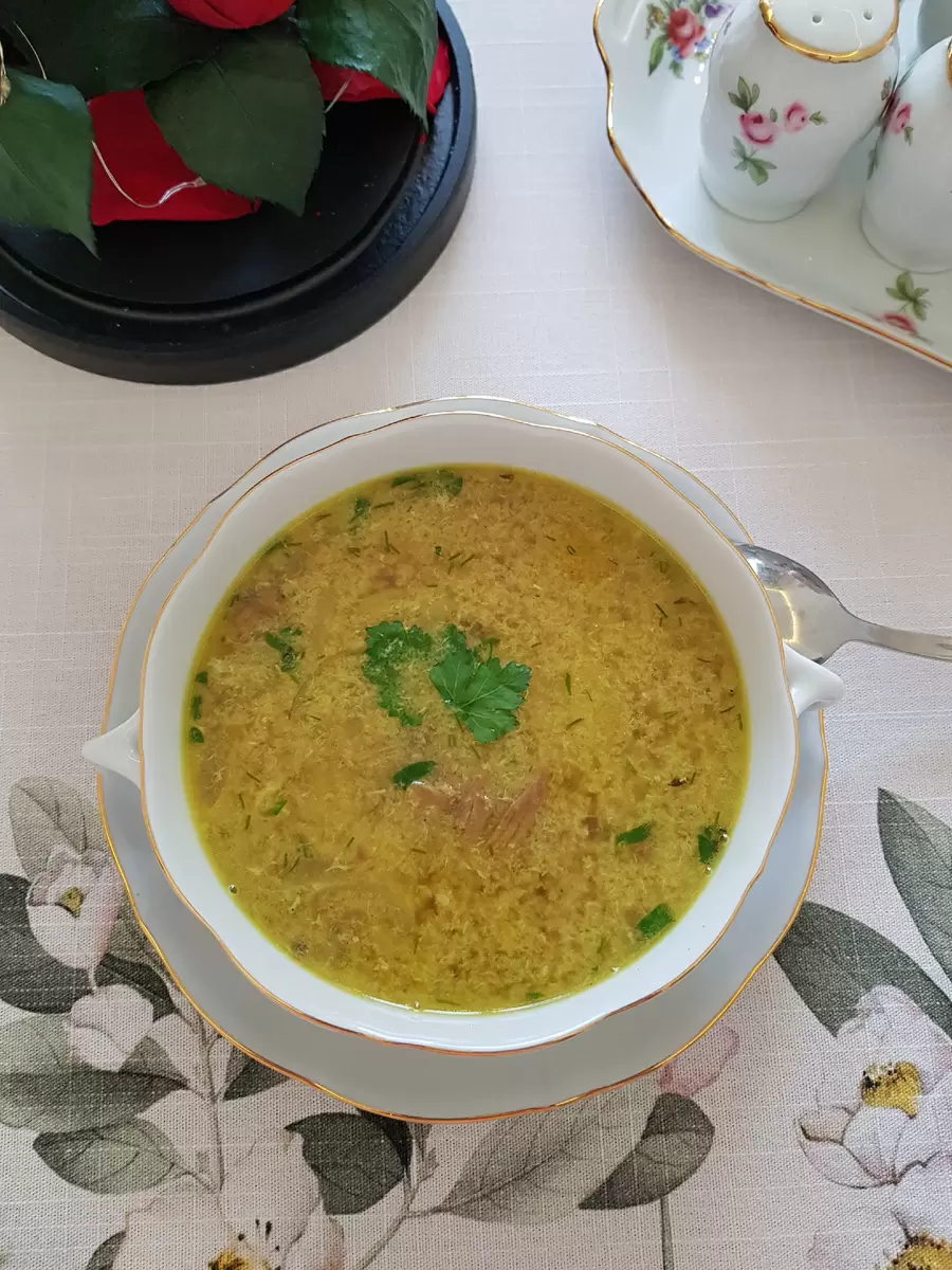 4. Завершение: Влить шафран в бульон, затем отделить желтки от белков, смешать их с уксусом. Отключить нагрев, добавить желтковую смесь, тщательно перемешивая, и украсить рубленой зеленью. Разлить по тарелкам и наслаждаться ароматным, сытным супом.