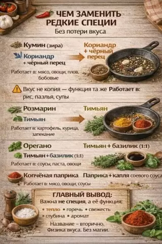 Создать насыщенный вкус блюд можно, используя более доступные специи. Главное — сохранить характерные нотки и функции оригинальных ингредиентов.