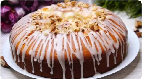 Глазурь делается из сахарной пудры и лимонного сока — моментальная, легкая и ярко освежающая. Готовый пирог остывает, после чего глазурь поливается сверху и дается нарезать порциями к чаю или кофе.