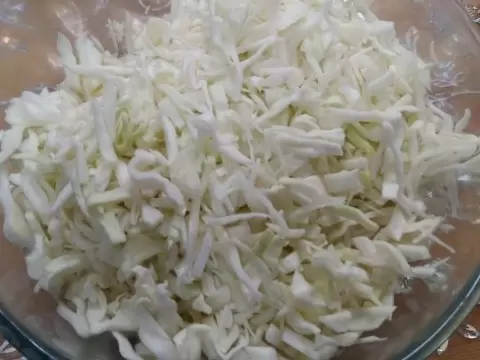 1. Начинаем с нарезки капусты соломкой. Грубая или тонкая – выбирайте, как вам больше нравится.