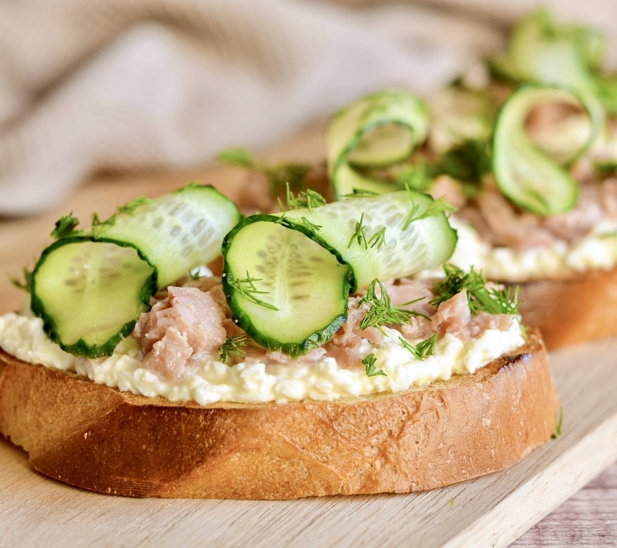 Для украшения огурец нарезается вдоль тонкими лентами и аккуратно укладывается на тосты, завершает композицию мелко рубленный укроп.
