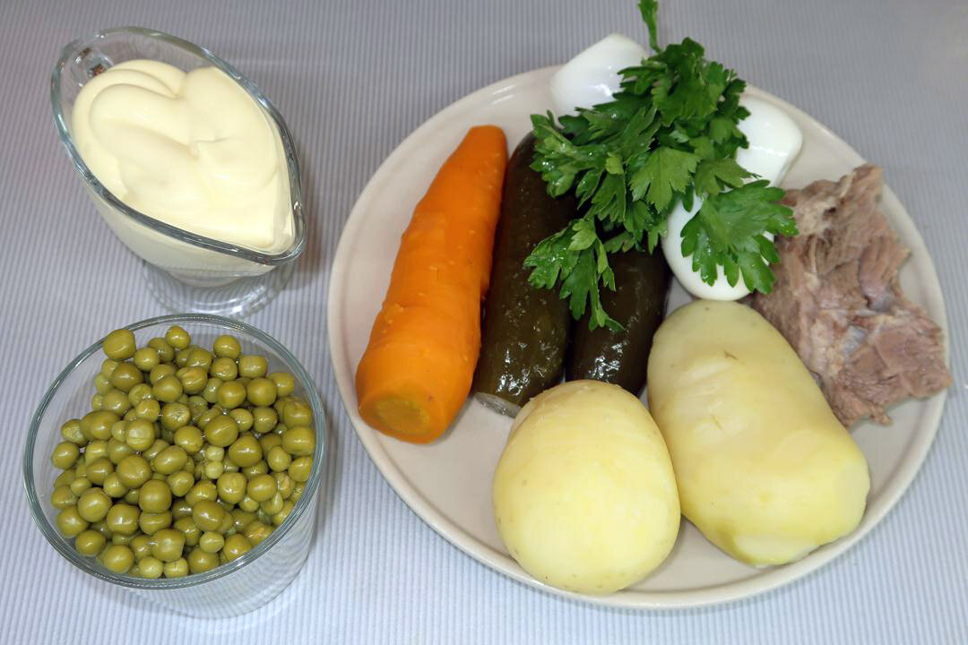 Готовится салат достаточно просто. Главные ингредиенты – отварная говядина, картофель, морковь и яйца. Заправка традиционная: майонез, для которого лучше использовать домашний вариант. Также можно использовать соус из сметаны и майонеза в равных пропорциях.