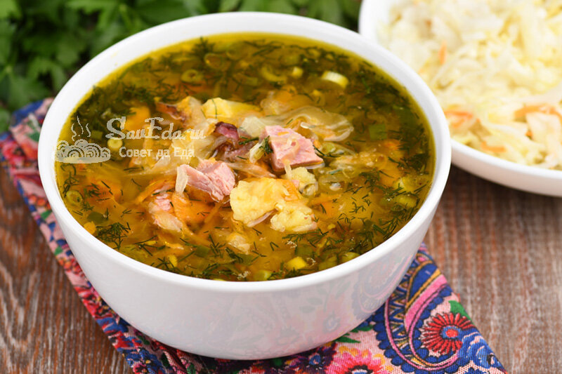 8. Разлейте щи по тарелкам и подавайте на стол. Копченое мясо придаст бульону насыщенность и тонкий дымный аромат, а квашеная капуста добавит приятную кислинку. Да, такие щи будут особенно вкусными на следующий день, когда все ингредиенты прекрасно «смешаются». Приятного аппетита!