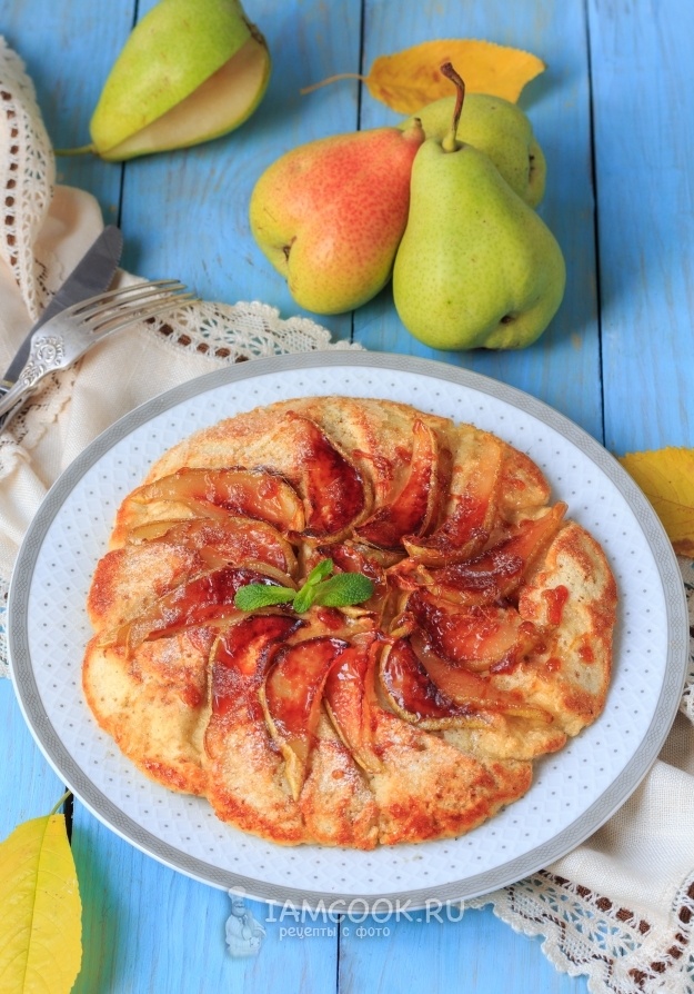 5. Подача: Когда время истечет, выключите плиту и аккуратно переверните блинчик на тарелку, чтобы груши оказались внизу. По желанию посыпьте сахарной пудрой и добавьте мелко нарезанную мяту для свежести.